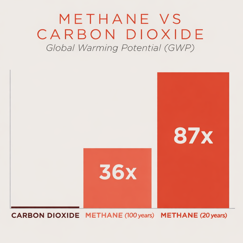 Methane is significantly more effective at trapping heat in the atmosphere than CO2—it has a global warming potential of 84 times that of CO2 over 20 years and is responsible for at least 30% of the global warming we are experiencing today.